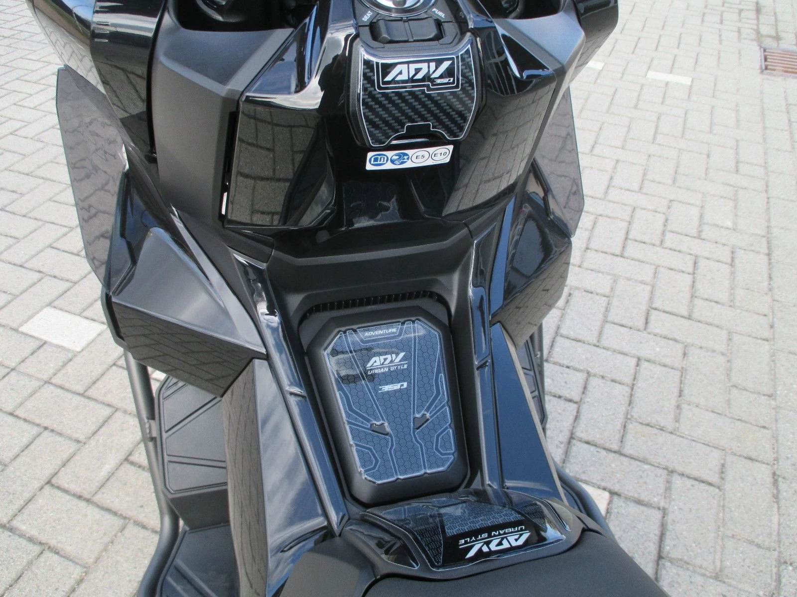 -Durchdacht und praktisch Während sich der ADV350 durch sein robustes Abenteuerdesign auszeichnet, haben wir dafür gesorgt, dass er dem treu bleibt, was große Roller ausmacht: Komfort und Praktikabilität. Der Sitz bietet guten Halt und ist nur 795 mm hoch, damit du mit den Füßen bequem den Boden erreichst. Unter den Sitzen gibt es 48 Liter Stauraum - genug für zwei Integralhelme - und ein Handschuhfach mit USB-Typ-C-Anschluss. Die LED-Beleuchtung im Fach unter dem Sitz verbessert im Dunkeln die Übersicht. Der Windschirm lässt sich in vier Stufen verstellen, sodass du die Höhe und den Winkel an deine Bedürfnisse anpassen kannst. In der hohen Einstellung wird der Luftstrom um deine Schultern herumgeleitet und verringert so bei längeren Fahrten die Ermüdung. Niedrig eingestellt, lässt sie eine kühlende Brise zu, perfekt für Fahrten in der Stadt.