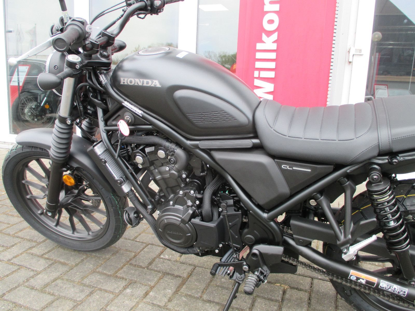 -Aufsitzen und losfahren Die CL500 wird mit allen Herausforderungen fertig, seien es unbefestigte Wege, gepflasterte Gassen oder Wochenendtouren. Die längeren Federwege schlucken Schlaglöcher und Fahrbahnunebenheiten und die tief profilierten Reifen vermitteln ein sicheres Gefühlt bei jedem Tempo. Die Sitzhöhe beträgt 790 mm, der Mittelteil ist schlank, sodass du den Boden leicht erreichen und bei niedriger Geschwindigkeit manövrieren kannst. Der Komfort wird durch ein neues Sitzmaterial und neu positionierte Fußrasten verbessert. Die Beinfreiheit ist großzügig bemessen (auf Wunsch ist eine höhere Sitzbank erhältlich) und der tief montierte Soziussitz erleichtert das Aufsteigen