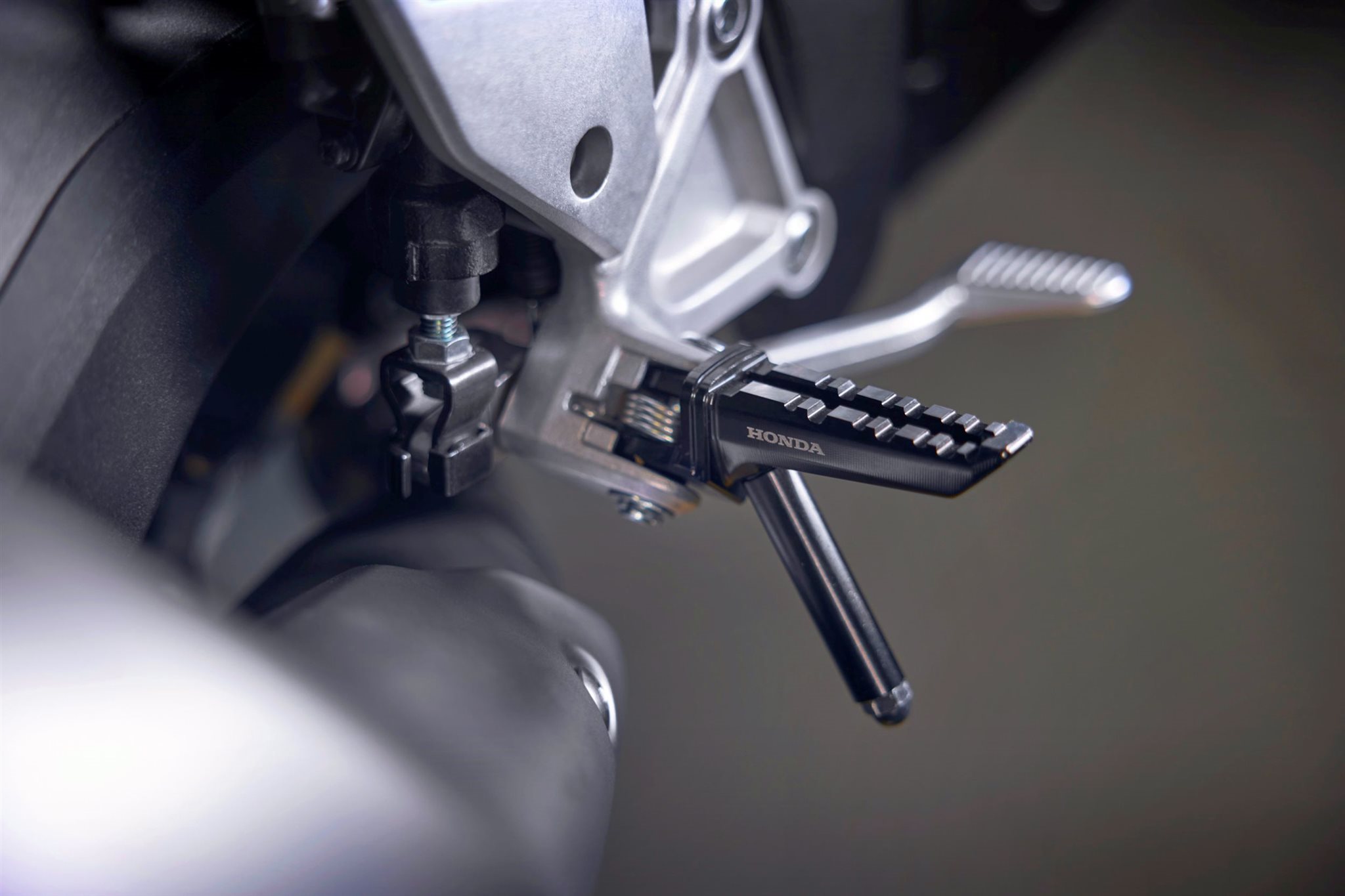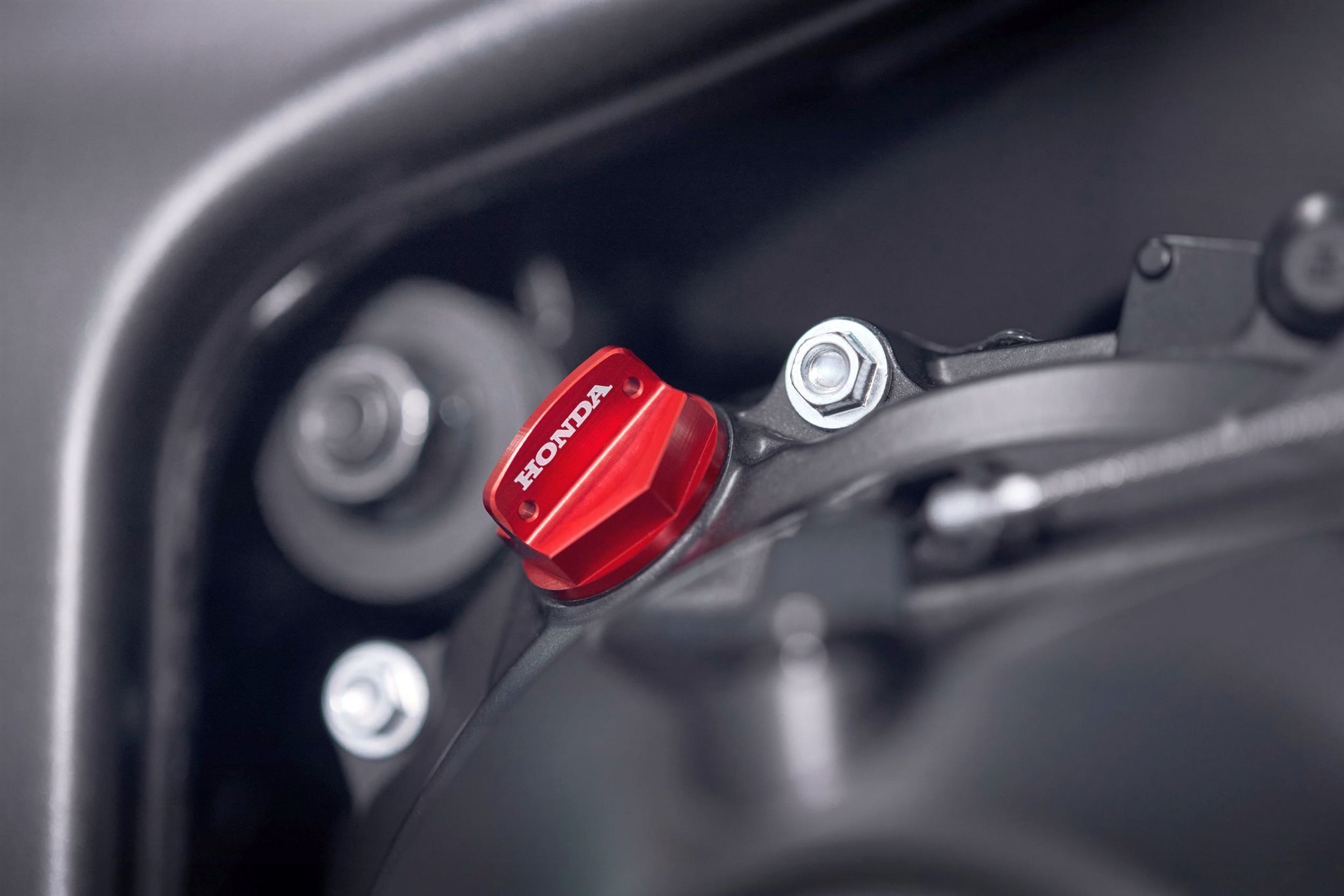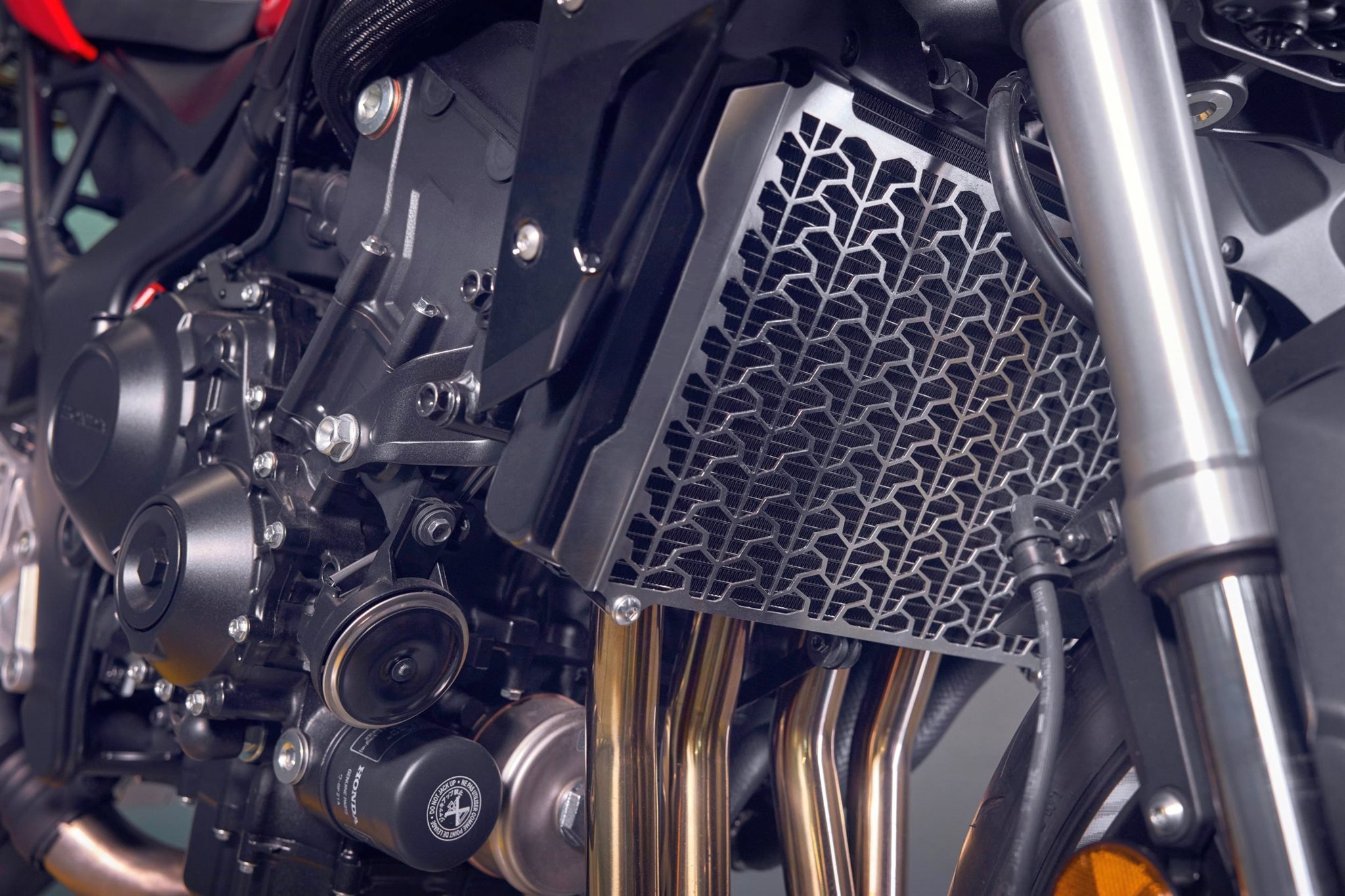 Das ist das Motorrad in seiner rohesten Form, straff definiert. Die kompromisslose Streetfighter-Attitüde der CB1000 Hornet wird durch den markanten, superkompakten LED-Doppelscheinwerfer unterstrichen, der passgenau in der diskreten Frontverkleidung sitzt. Der dezent geschwärzte Rahmen bringt ein starkes Element des geschmeidigen Designs mit sich und unterstreicht die Linienführung ebenso wie der hintere Hilfsrahmen im Spalierstil. Um ihr einen aggressiven Look zu verleihen, sind der Motor, die Räder und die Schwinge ebenfalls in Schwarz gehalten. Und der für die Hornet charakteristische, breitschultrige Kraftstofftank, der sich radikal nach hinten verjüngt, steht für pure Leistung.