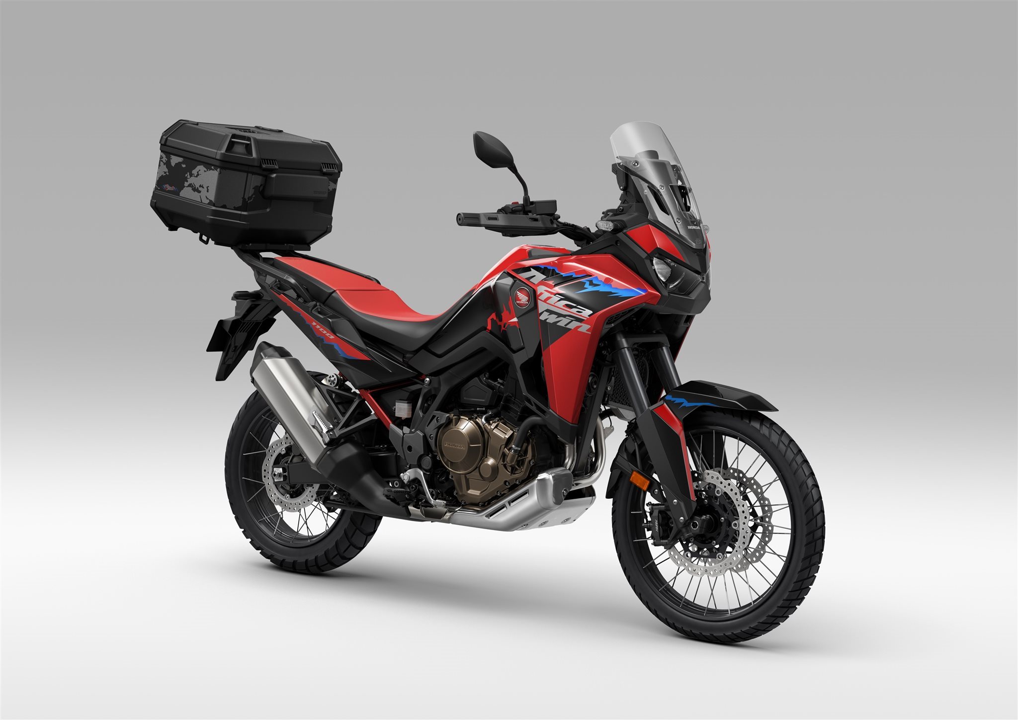 -Die Africa Twin ist ab sofort in einer neuen Variante erhältlich. Die Leistung des gewohnt agilen Adventure-Bikes setzt neue Maßstäbe und zeichnet sich besonders durch das zusätzliche Drehmoment im unteren Drehzahlbereich aus. Die neue verstellbare Verkleidungsscheibe macht die Tage auf der Straße wesentlich komfortabler. Die schlauchlosen Reifen lassen sich leicht reparieren.
